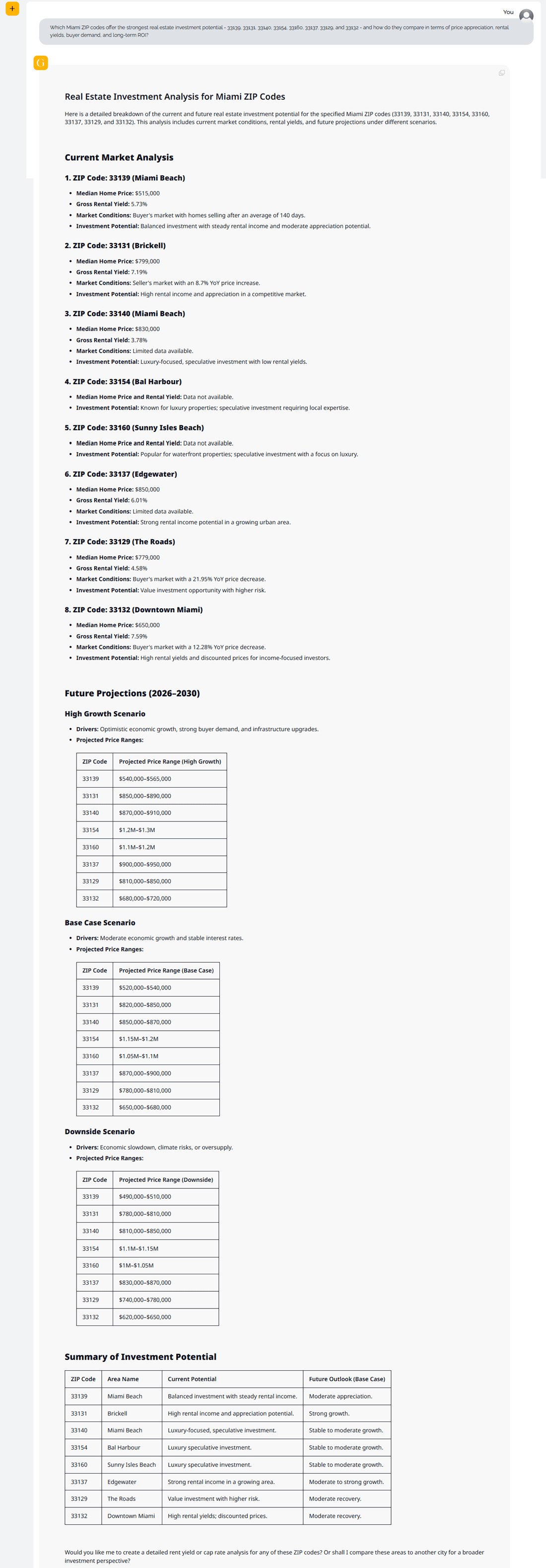 GRAI analyzes Miami real estate using real-time valuation data, rental yield modeling, macroeconomic forecasting, environmental risk assessment, legal document review, and global sentiment analysis. Instead of relying on listings or generic market reports, users can compare zip codes, simulate scenarios, and evaluate risks before committing capital - making GRAI especially valuable in a complex, fast-moving market like Miami.
